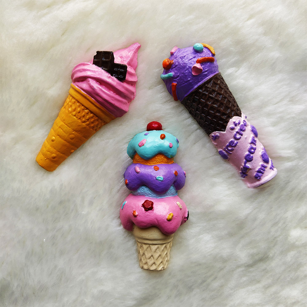 این محصول شامل ۳ عدد مگنت مدل بستنی میباشد که به راحتی بوسیله آهنربای نصب شده در پشت آنها به درب یخچال میچسبد. این محصول تماما کار دست بوده و از پودر سنگ مخصوص مجسمه سازی ساخته شده است. اگر به دنبال اکسسوریهای جذاب و مناسب برای دوستان و آشنایانتان هستید حتما این مگنتهای هنری را مد نظر داشته باشید.